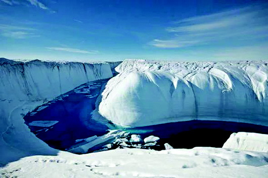 据报道,格陵兰冰盖表面,在夏天时融化形成数千个湖泊,属于正常情况。许多湖泊能在几小时内干涸,在冰盖底层留下裂口,最深的有一千米。而在融冰季,冰盖表面融化的水持续流入下方的裂口,甚至形成瀑布,在高峰时,这些湖泊干涸速度每三秒钟可流逝掉一个奥林匹克游泳池大小。
