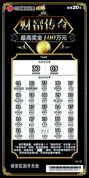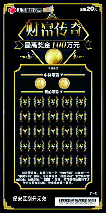 “财富传奇”彩票面值20元,头奖100万元,奖级12级,返奖率65%,中奖面34.18%。
