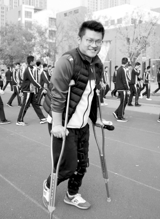 2019年11月初,历城区初级实验中学的学生们刚刚走进校门就发现,和往常一样在校门口值班的体育老师宋玉成不一样了——他拄上了双拐。从早上到晚上的值班,每天的大课间活动和体育课,都少不了宋玉成拄着双拐忙碌的身影。