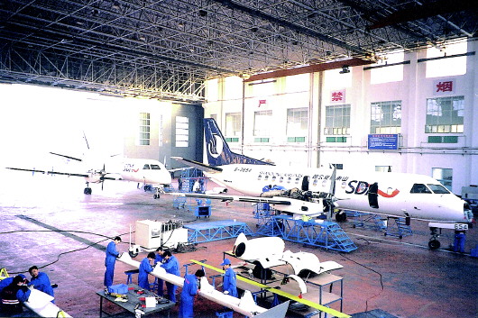 机务工程师们正在山东太古机库中检修山航飞机(资料片)