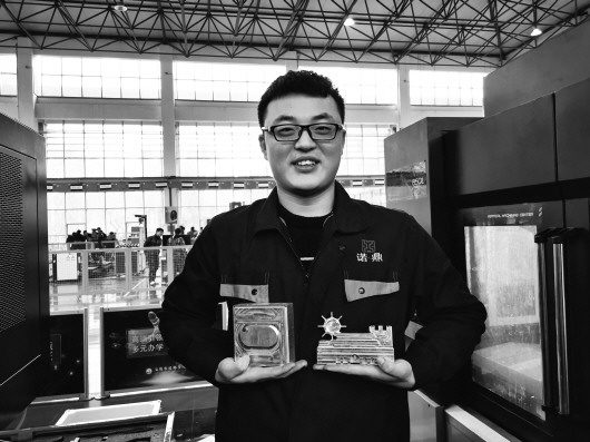今年4月份,闫文凯首次接触数控铣加工时,铝件和钢件都无法加工成型,作品不仅表面粗糙,还经常过度切割。“我从加工一个方台或者圆台开始练,在仪器操作和保证工件质量上,基本功整整练了两个月。”闫文凯介绍,6月份后,自己一个星期练一套题,一套图纸干一周,一周内必须把题目研究透彻。
