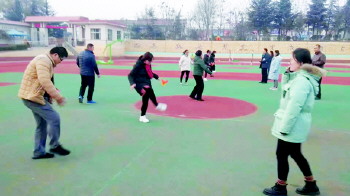 “我踢”我快乐活动 为提高老师们参加体育锻炼的积极性,近日,沂源县东高庄小学举行了“‘我踢’我快乐”活动。全体教师都积极参与其中。 (魏良)