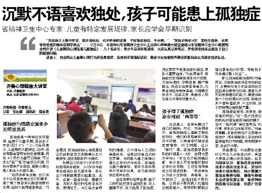 “我这孩子上课不听讲,离开座位玩,也不听老师讲课,平时独来独往,不合群。”“我孩子现在14岁,爱吃生面条,还把奇奇怪怪的物品带到学校去”……12月26日,本报和山东省精神卫生中心主办的心理健康大讲堂邀请山东省精神卫生中心教授刘金同开讲《儿童期的心理发展与孤独症》,几十名家长、青少年前来听取讲座,大家认真记录笔记,并在讲座结束后提出了自己的疑难问题。