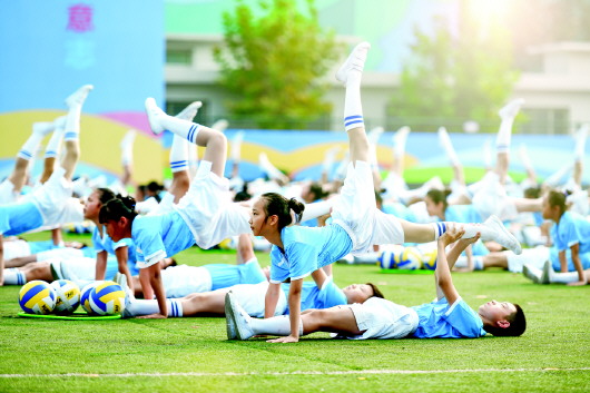 天桥区举行体育特色成果展,行知小学学生现场展示。