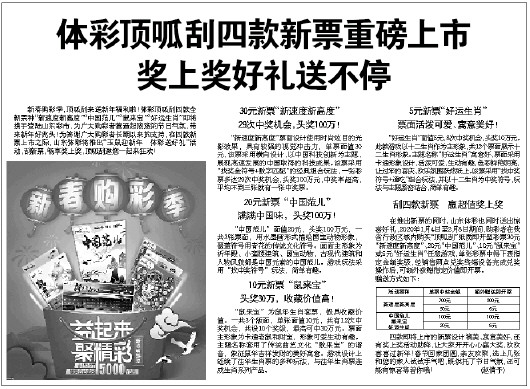 四款即将上市的新票设计精美、寓意美好,还有奖上奖活动助阵,让大家开开心心赢大奖,欢欢喜喜过新年!春节回家团圆,亲友欢聚,选上几张和您的家人试试手气吧,既烘托了节日气氛,还可能有惊喜等着你哦! (赵倩予)