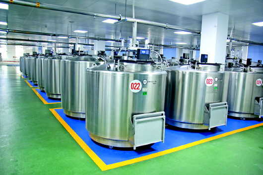 山东省脐血库现有建筑面积3.2万平方米,其中实验室建设面积1.5万平方米,包括干细胞制备生产车间及附属设施等项目。按照相关规范要求建设了70余万份库容量的液氮库(包括样本冷库),配置了先进的Thermo液氮生物容器、MVE液氮生物容器等脐血存储装置,并配备了监控报警系统,实时监测各液氮罐液位、温度及库内其他情况。液氮库由专人进行管理,制定了相应安全保护措施,充分保证脐血及人员的安全。