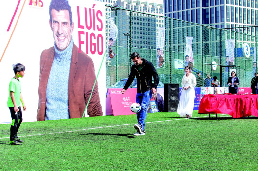 ▲作为青训大使,足球巨星菲戈正在指导小球员。