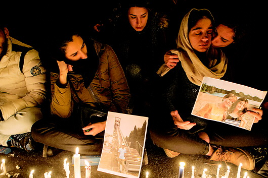 1月11日,在伊朗首都德黑兰,民众在乌克兰失事客机遇难者的悼念仪式上点燃蜡烛寄托哀思。
