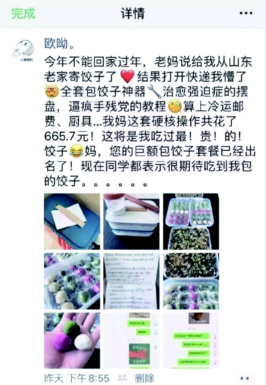 在收到妈妈寄来饺子套餐的当天,小李发布了一则朋友圈:“今年不能回家过年,老妈给我从山东老家寄饺子了,结果打开快递我蒙了,全套包饺子神器,治愈强迫症的摆盘,逼疯手残党的教程。算上冷运邮费、厨具……我妈这套硬核操作共花了665.7元!这将是我吃过最!贵!的!饺子。妈,您的巨额包饺子套餐已经出名了,现在同学都表示很期待吃到我包的饺子……”