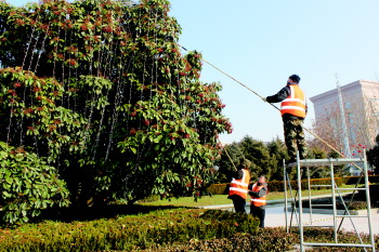 14日上午,新世纪广场便热闹了起来,数十名施工人员分散于广场各处,或整理灯饰、悬挂彩灯,或驻足于台阶处铺设灯带,现场一片繁忙景象。记者步行至广场南侧的石楠树绿化带处,3名施工人员分别手持5米特制长杆,小心将灯饰挂至树顶,并垂直缠绕在树干上。不一会的功夫,原本郁郁葱葱的石楠树摇身成为了身披“星辰”的彩灯树。
