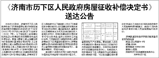 《济南市历下区人民政府房屋征收补偿决定书》