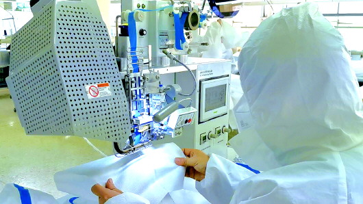 “这台设备就是从德国法兰克福紧急空运过来的。”在生产车间,吴健民向记者介绍了一台新设备。“它解决了目前国内生产防护服的三大工序的瓶颈问题,目前国内生产防护服是通过包缝、缝制、压胶条三道工序,而这台超声波黏合机可以三合一,一次完成,这个机器做好的防护服可以达到德国标准,目前物理检测、外观检测都非常好,现在国家质检总局正在对我们送检的产品进行检测,一旦质检符合国家标准,我们将大量使用这样的机器来替代目前的传统工艺,将提高效率两倍以上。”
