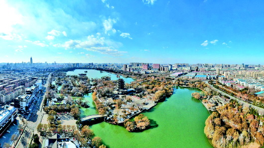 蓝天白云下的大明湖格外美丽。 齐鲁晚报·齐鲁壹点记者 王鑫 摄