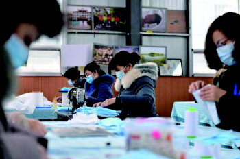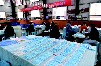 2月19日下午3点,记者来到莒县中医医院,测体温、登记,一系列检查后,记者来到职工活动中心。在偌大的活动场地里,由于疫情原因,运动设施都已经清空。有十多个职工正在这里手工缝制着口罩,在现场,有三台缝纫机,用桌椅以及乒乓球桌子搭建的临时工作台,职工们正在紧张地工作着。