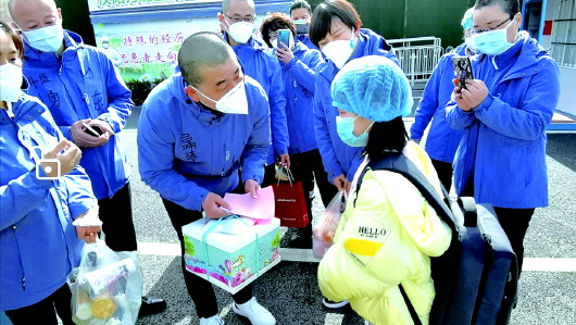 远远看到雯雯从通道走出来,走到消杀处,山东省第八批援助湖北医疗队领队、省立三院院长吕涌涛大声喊道:“雯雯,我们来接你出院了,还给你带了蛋糕。”雯雯听到后,朝大家使劲挥了挥手,然后抹起了眼泪。