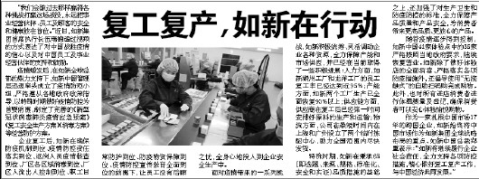 企业复工后,如新在确保防疫机制到位、疫情防控责任落实到位、返岗人员疫情核查到位、厂区各区域消毒到位、厂区人流出入控制到位、职工日常防护到位、防疫物资保障到位、疫情防控宣传教育全面到位的前提下,让员工没有后顾之忧,全身心地投入到企业安全生产中。