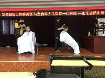 在鱼台县人民医院,山东省脐血库的志愿者们联系的两位理发师,正在快速地给医护人员进行理发。这是细心的志愿者看到医护人员时间太紧张而长时间不能理发时,专门联系了理发师,对于下班后的医护人员们集中进行理发,得到了医护人员的支持和点赞。