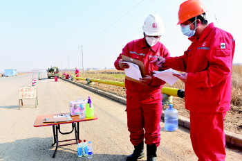 ◥河口采油管理七区党员对施工人员健康信息进行检查。