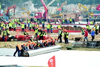 今年40岁的刘一是中建三局(山东)公司潍坊迪梦小镇项目负责人,在1月31日他就赶赴了武汉,先后参建火神山、雷神山医院,是现场组一员。“我在火神山负责2号工区的墙板、门窗安装和收尾等工作,在雷神山负责C2工区的维修。我们工作大致上分为白班和夜班,原则上一个班14个小时,但实际上由于各专业人员的排班时间不同,我们往往是落实完某项工作再交班,一般都会工作18小时左右,最长的一次我们连续干了30小时。”刘一说,对于他来说最有挑战的大概是体能了,现场情况不允许任何人坐办公室休息,每天工作的十多个小时一直需要走来走去,且收尾阶段活很杂,有时候人手不足他们都必须亲自上阵。