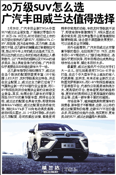 2月28日,广汽丰田全新TNGA中型SUV威兰达全面发售,厂商建议零售价为17.18万-24.18万元。针对目前已经上市的20万级比较热的几款SUV,包括RAV4、C-RV、探岳等,因为各有特色、实力均衡,且品牌力不错,这几款车的销量或订单都相当可观,想必对今年上市的威兰达造成了压力,所以这次威兰达公布的价格还是挺让人感到意外,以广汽丰田的招牌以及TNGA的诸多卖点,加上具有竞争力的价格,广汽丰田似乎是要在2020年借这款车大干一场。