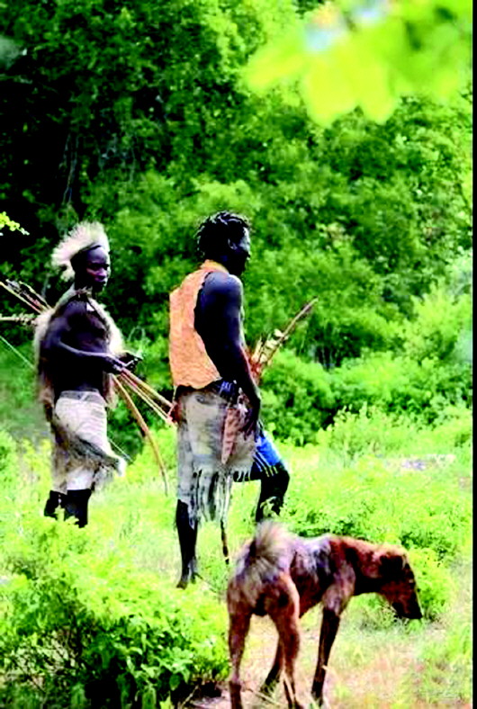 上午八点出发,沿着土石路,往东南方向行驶,进入丛林地区。三四十分钟后,到达哈德扎比人的暂居地附近。车子无法再行进了,司机在车上等待,我们三人随着向导开始爬坡。向导说,哈德扎比人居无定所,如果在这座山上见不到他们,就得到别处去找。我们的运气不错,很快就看见了他们。在一块巨岩下,十来个看起来黑黢黢的男子坐在一堆快要熄灭的灰烬前,有的吸着自制的土烟,有的在削制工具。他们大多袒胸露臂,少数身着狒狒皮或羚羊皮。我们打招呼,他们没有回应,只是平常地看着我们。