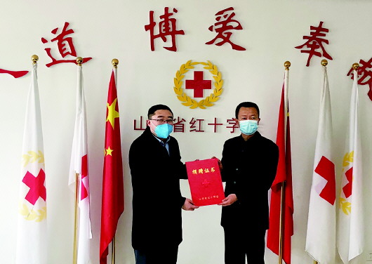 3月6日,山东省分公司总经理康成峰携相关同志应邀赶赴山东省红十字会,与协会汪秘书长会面并亲切交流,汪秘书长亲自为分公司颁发证书及收款凭据,并介绍疫情以来红会的工作情况。康总向红会介绍分公司发展情况及抗疫举措,重点指出总公司特制定捐赠方案,针对山东省医疗系统抗击疫情为一线医护和疾控人员及其家属捐赠总保额逾百亿的专属保险产品和服务,全力以赴做好疫情防控的保险保障支持工作。