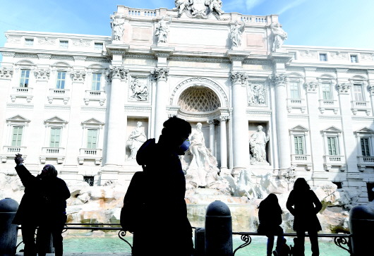 3月9日,在意大利罗马,一名戴口罩的男子从许愿池前走过。 新华社发