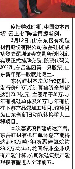 3月12日,山东东岳有机硅材料股份有限公司(东岳硅材)成功登陆深圳证券交易所创业板,实现正式挂牌交易,股票代码为300821。东岳集团第二只股票、山东新年第一股就此诞生。