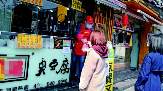 在宽厚里有一家臭豆腐店是网红小吃店,以往游客要排很长的队才能吃上臭豆腐,13日前来尝鲜的市民基本不用排队就能吃到。在一个小时的时间里,有七拨顾客前来购买臭豆腐,还有4名市民在网上下了外卖订单,该店复工首日取得了不错的业绩。