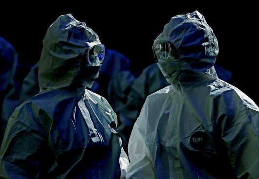 3月11日,韩国大邱启明大学东山医院的两名医护人员。 新华/纽西斯