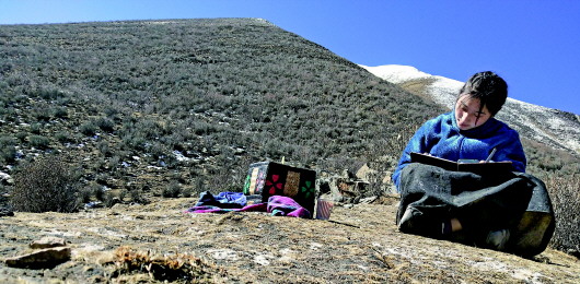 土姆拉增席地而坐,还在这里留下了记号。从那天起,只要不下雪,每天清晨,她和奶奶都会提一暖瓶热水,背一包干粮,在山上坚持学习,常常一学就是好几个小时。奶奶心疼,让她戴上帽子遮挡山风,可青藏高原的寒冷还是冻得她伸不出手来。