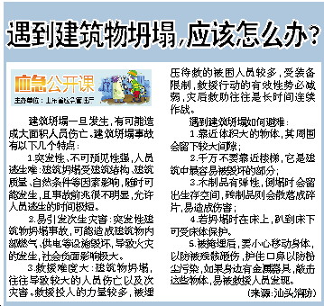 5.被掩埋后,要小心移动身体,以防被残骸砸伤,护住口鼻以防粉尘污染,如果身边有金属器具,敲击这些物体,易被救援人员发现。
