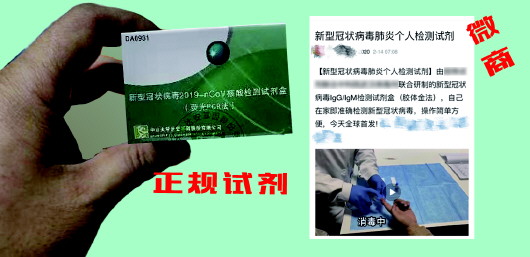 根据我国相关规定,此类产品上市销售需有医疗器械注册证。面对记者询问,该微商称,试剂盒的注册证“没有下来”,因为“疫情突发时间赶不上,试剂盒研发出来后仍在注册,当前供给医院也是直接用的”。他还向记者保证,该款试剂盒有质检报告证书,但并未向记者出示。