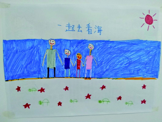 ▲妹妹出生后,小涵宇画了一幅一家四口一起去看海的画。