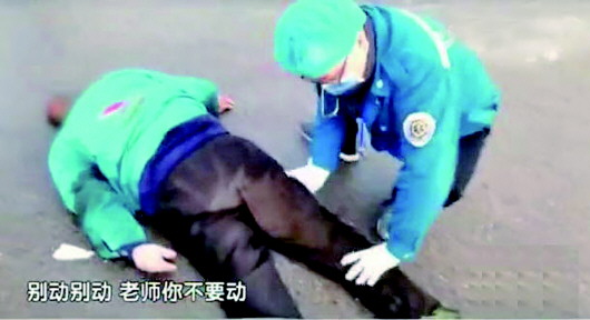 “按平时经验,人与车相距那么远,应该撞得不轻。”周国帅赶紧将车靠边停下,迅速从后备厢内拿出急救用品、套上急诊服,大跨步奔向受伤男子查看情况。只见该男子头部颅骨已经凹陷,鲜血不断流出。他戴上手套、口罩、帽子,手持听诊器跪地为男子进行了简单查体,而后进行止血、包扎,并用衣服护住他以防受凉。