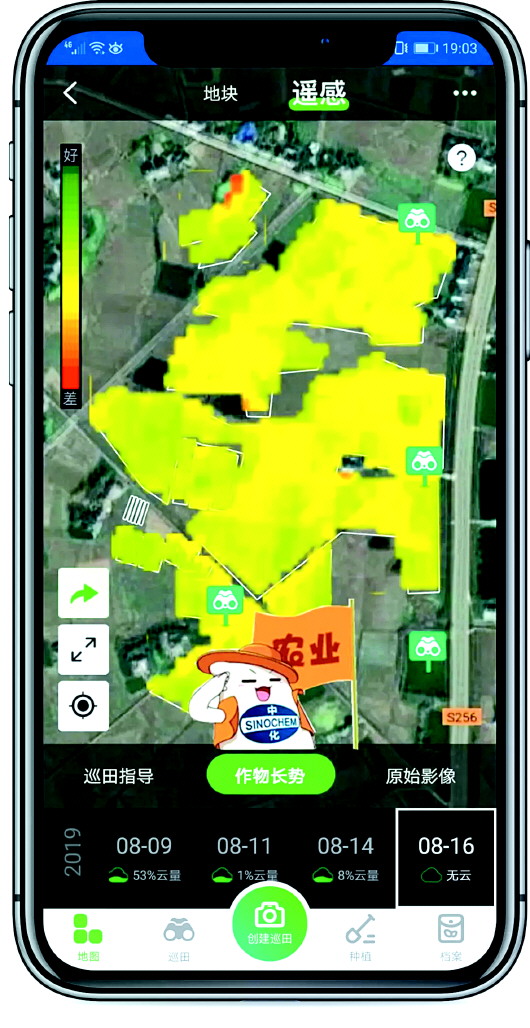 利用“MAP智农”APP,采用卫星+无人机遥感技术,能够为农场主提供科学的巡田方案,全面掌握地块数据,实时监测并识别分析作物长势,含水量等情况,在家即可查看田地里庄稼生长情况,实现农民“在手机上种田”。另外,在APP的基础上,中化农业还推出了全方位、人性化的订单式经营模式。