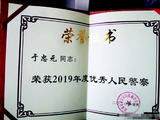 ◤因为工作出色,于忠元获评2019年度优秀人民警察。