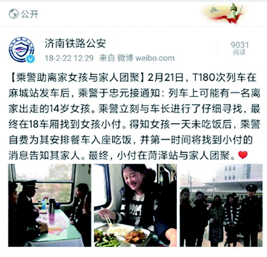 大学毕业后,于元忠成为一名乘警。2018年,他在火车上曾自费救助过一名走失的14岁女孩。