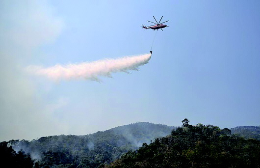 4月1日,四川西昌,直升机从空中洒水对林间烟点进行清剿。