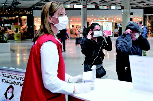 奥地利宣布,4月1日起民众必须佩戴口罩才能进入超市。德国图林根州城市耶拿要求,市民在购物、搭乘公交和进入大流量建筑时必须佩戴口罩。在意大利、法国、比利时等国,戴口罩或用围巾遮面自我保护的民众越来越多。