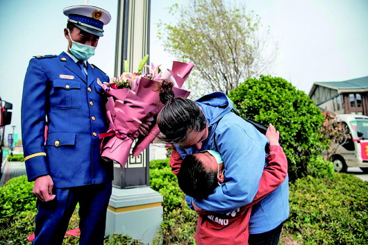“我是特地来接我妈妈的,已经两个多月没见到了,很想她,家里已经准备好了红烧鲅鱼等好菜。”青岛市第一批支援湖北医疗队队员、青岛市市立医院东院呼吸内科护士长孙文欣19岁的儿子栾鸿宇怀抱鲜花,见面后给了孙文欣一个紧紧的拥抱。