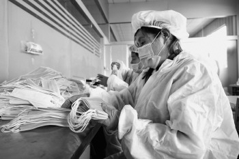 曲阜市鲁丰达服装有限公司职工正在包装口罩。