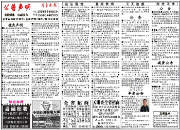 挂失声明   ●无棣杜氏老味食品有限公司(统一社会信用代码91371623MA3QRY33X6)遗失营业执照副本以及公章、财务专用章各一枚,声明作废。   ●天元建设集团有限公司遗失料具结算核验单丢失第一联和第三联单据号码和金额为:单号:LJ-00000020320004-0024金额:69310.92元,LJ-00000020320004-0025金额:15738.86元,LJ-00000020320004-0026金额:35213.24元,LJ-00000020320004-0027金额:61221.5元,LJ-00000020320004-0028金额:1972.4元,声明作废。   ●梁山凯运达汽车贸易有限公司车鲁H277M挂道路运输证丢失,证号370832329999,声明作废。   ●梁山恒广汽车贸易有限公司车鲁HN0Y4挂道路运输证丢失,声明作废。   ●梁山三军汽车贸易有限公司车鲁H197Q挂道路运输证丢失,声明作废。   ●梁山宏星汽车销售服务有限公司车鲁HYZ17挂道路运输证丢失,声明作废。   ●梁山国文运输有限公司车鲁H23J87道路运输证丢失,证号370832910487.车鲁H489K挂道路运输证丢失,证号370832910488,声明作废。   ●无棣绿泰工艺品有限公司(注册号371623200019514)遗失营业执照副本以及公章、财务专用章各一枚,声明作废。   ●梁山财源汽车贸易有限公司车鲁H21K82道路运输证丢失,声明作废。●财运国际货运代理(梁山)有限公司车鲁H999F挂道路运输证丢失,声明作废。   ●梁山萌诺运输服务有限公司车鲁HM2C8挂道路运输证丢失,声明作废。   ●高润佳丢失警察证,证号:131571,特此声明挂失   ●邹城市亿嘉置业有限公司丢失邹城市房地产管理局开具的配套押金缴款票据,票号121011405176,日期2006年9月15日,金额捌拾万元整(小写800000.00元)特此声明。   邹城市亿嘉置业有限公司   2020年4月7日   ●1遗失声明:现丢失收款登记单四份(收据号:SK-1507002413/SK1506044414/SK-1506070898/SK-1506077633)付款人:单祖光,收款单位:上海红星美凯龙管理有限公司济宁分公司,合计金额:30000元,收费项目:质量保证金,声明作废。   2遗失声明:单祖光(342210197310270815)不慎丢失与济宁瑞马物业有限公司开具的收款收据一份(No.4084045)声明作废。   ●山东航龙物流有限公司,国内水路运输经营许可证,正副本丢失,编号:鲁航管XK103050,声明作废   ●微山县汇鑫航运有限公司,国内水路运输经营许可证,正副本丢失,编号:鲁航管XK103030,声明作废   ●范传龙230622198208154691购买济宁北湖恒大名都置业有限公司5-1-3001室,不慎丢失收据HM0003946(金额54万)一张,声明作废   ●齐河县我的好声音练歌房营业执照正副本丢失,注册号371425600256392,声明作废   ●山东青途工程机械租赁有限公司丢失公章:3708313017095、财务专用章:3708313017096、合同专用章:3708313017097、法人章:王新:3708313017098、发票专用章:3708313017099,税号:91370831MA3PHPQF4R,声明作废。   ●济宁市艺馨企业管理中心(税号91370831MA3P0QG08W)发票专用章丢失,编号3708313013477,声明作废   ●济宁德聚化工有限公司,地址:济宁高新区黄屯镇蒋屯村,税务登记证(证号:鲁税济字370882661351422号)正副本不慎丢失,声明作废。   ●济宁正达信物业服务有限公司丢失公章号3708023005197、财务专用章号3708023005198、法人章郑曙东、发票专用章号91370811MA3F7QTD6F,声明作废。   ●王允勇购买江铃牌载货汽车,车架号:LEFAECG2XJHN34755,发动机号:JX493ZLQ5,合格证编号:WCP1X0111595846,合格证丢失,特此证明。   ●泗水县泗张镇华伟木材加工厂丢失财务专用章,编号3708313013909,声明作废   ●金乡县金安物流有限公司公章编号3708280027078,财务章编号3708280027079一并丢失,声明作废。   ●济宁凯杰物流运输有限公司车鲁HF2J4挂,道路运输证丢失,声明作废。   ●济宁朝旭汽车贸易有限公司车鲁H898P挂,道路运输证丢失,声明作废。   ●张丽370802197607093322认购济宁北湖恒大名都置业有限公司影城商业104室,不慎丢失认购书编号90974壹张和收据编号HM0012292(金额628742元),声明作废。   ●鱼台华畅汽车销售有限公司车鲁H7P511营运证丢失,证号370827332668,声明作废.   ●济宁市泰泽商贸有限公司营业执照正本丢失,统一社会信用代码913708005739093693,声明作废。   ●菏泽市高新区华西文体用品店遗失营业执照正副本,统一社会信用代码:92371700MA3QD1U6XT,声明作废。   ●郑龙坤(370830198111250830)丢失济宁市汶上县开发区如意花园北区68号楼1单元1201室购房合同,声明作废。   ●临清市人民医院分院(临清市青年路街道社区卫生服务中心)遗失事业单位法人证书正副本,统一社会信用代码:12371581495053621W,声明作废。   ●遗失:凯马牌KMC5142JQZ8ST合格证一套,车架号LWU5PM3C7JKM00154,发动机号:WA335996,声明作废   ●济宁景远商贸有限公司财务专用章丢失,编号3708020023894,声明作废   ●山东博瑞源煤化工有限公司公章不慎丢失,特此声明原章作废。   ●济宁市聚通经贸有限公司丢失税务登记证副本(鲁税济字:370802053444713号)、公章、财务章、法人章、发票章,声明作废。   ●王兵丢失济宁海达融创置业有限公司开具收据1张,收据号0010755,金额416543元,声明作废。   公 告   ●2019年07月19日22时31分许,王宝军(驾驶证号:370811197404100517,档案编号:370800689104)醉酒驾驶机动车在济宁市琵琶山路舜泰园小区附近被查处,现因其驾驶证原件丢失,特公告作废。   济宁市公安局交通警察支队高新区勤务大队   2020年04月08日   ●2019年7月8号14时30分孟庆彬(驾驶证号:370832198205084434,档案编号:370800925924),在梁山县拳铺镇卫生院东500米附近醉酒驾驶机动车,被执勤民警当场查获,因其未向公安机关