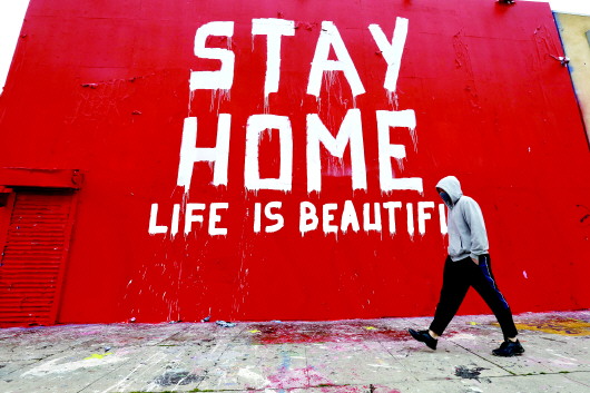 4月9日,一名男子经过美国洛杉矶市区的防疫主题壁画。