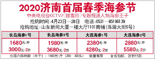 2020济南首届春季海参节 中央电视台CCTV7《致富经》专题报道人物海参王子 抢购时间:4月23日—28日 电话:0531—85196139 抢购地址:山东新闻大厦一楼大厅1101商铺(泺源大街6号) 火爆六排刺参(半干):1500元/斤(200—300头) 数量有限 全省包邮,货到付款。 长岛海参1号 大连海参1号 长岛海参2号 大连海参2号 1680元/斤 3000元/2斤 2880元/斤 5580元/2斤 1980元/斤 3680元/2斤 2380元/斤 4280元/2斤