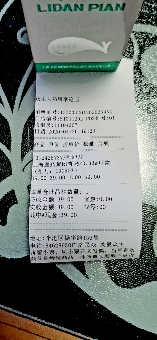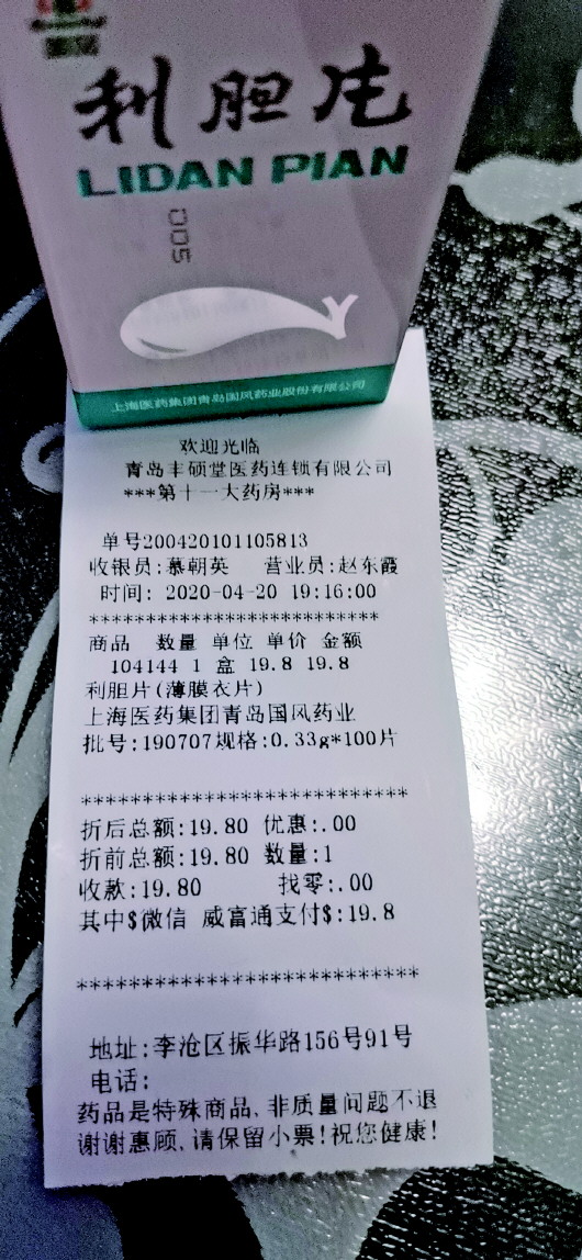 21日,齐鲁晚报·齐鲁壹点记者见到了肖先生,在他手中看到了他购买的两盒利胆片的票据,显示众生大药房的为39元/盒,丰硕堂大药房的为19.8元/盒。