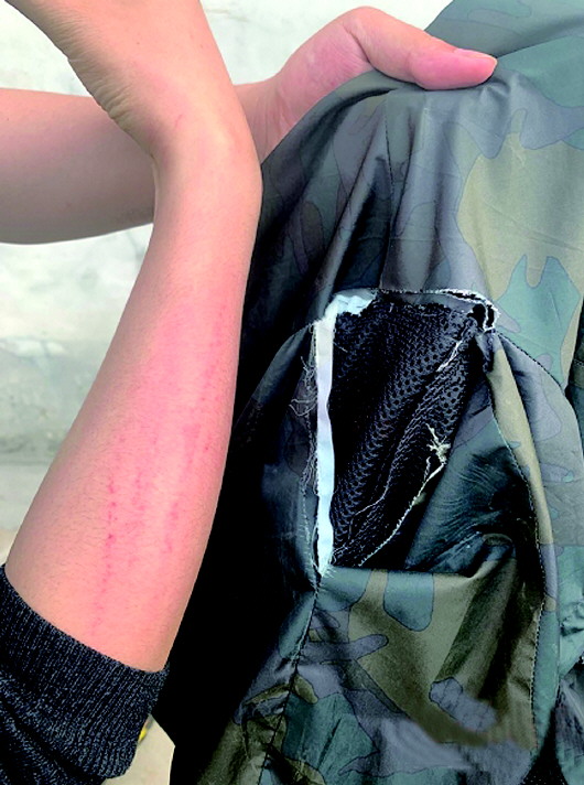 被打记者展示伤痕和被撕破的衣服。图片源自网络
