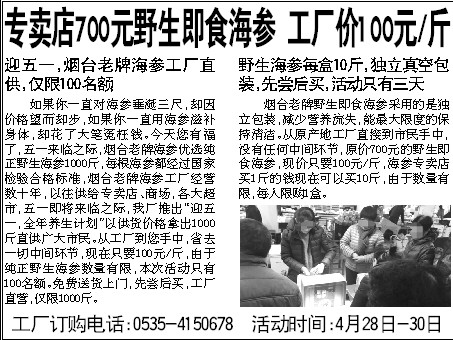 如果你一直对海参垂涎三尺,却因价格望而却步,如果你一直用海参滋补身体,却花了大笔冤枉钱。今天您有福了,五一来临之际,烟台老牌海参优选纯正野生海参1000斤,每根海参都经过国家检验合格标准,烟台老牌海参工厂经营数十年,以往供给专卖店、商场,各大超市,五一即将来临之际,我厂推出“迎五一,全年养生计划”以供货价格拿出1000斤直供广大市民。从工厂到您手中,省去一切中间环节,现在只要100元/斤,由于纯正野生海参数量有限,本次活动只有100名额。免费送货上门,先尝后买,工厂直营,仅限1000斤。