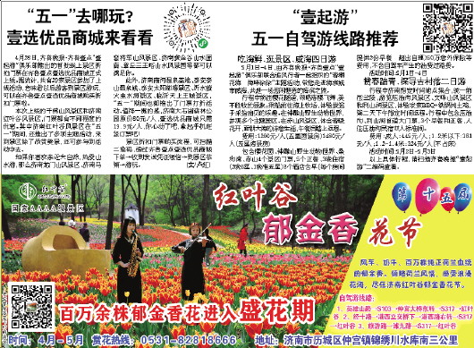“五一”去哪玩? 壹选优品商城来看看   吃海鲜、逛景区、威海四日游   5月1日-4日,由齐鲁晚报·齐鲁壹点“壹起游”俱乐部联合追风行者一起组织的“春潮花海 海峰徐徐”主题活动,带您走进海滨城市威海,共赴一场悠闲惬意的海滨之旅。   行程中前往樱花隧道,领略落樱飞舞,美不胜收的景象。乘船前往海上牧场,体验拔笼子采拾扇贝的乐趣。在神雕山野生动物世界,参观多个主题园区。在赤山风景区,体会春暖花开,面朝大海的诗意生活,午餐后踏上返程。   费用:1280元/人(五星园景房)1480元/人(五星海景房)   包含樱花园、神雕山野生动物世界、桑沟湾、赤山4个景区门票,5个正餐、3晚住宿(2晚5星、1晚准五星)3个酒店含早(每个房间提供2份早餐 超出自理)50万意外保险等费用,不含自驾车产生的油费过路费。   活动时间:5月1日-4日   赏春踏青、探寻古村落二日游   行程中济南指定时间地点集合,统一前往兰陵,游览压油沟风景区、文峰山风景区和利山涧景区,体验农家BBQ+铁锅炖土鸡,第二天下午指定时间返程。行程中包含压油沟、利山涧首道大门票,3个早餐和正餐,入住压油沟民宿双人标准间。   费用:成人:445元/人;1.2米以下:181元/人;1.2-1.4米:324元/人(不占床)   活动时间:5月2日-5月3日   以上具体行程,请扫描齐鲁晚报“壹起游”二维码查看。   4月28日,齐鲁晚报·齐鲁壹点“壹起游”俱乐部推出的首批线上景区折扣门票在齐鲁壹点壹选优品商城正式上线。据统计,共有29家景区参加了上线活动,意味着以后游客到景区游玩,可以在齐鲁壹点壹选优品商城购买折扣门票啦。   本次上线的千佛山风景区和济南红叶谷风景区,门票都有不同程度的优惠。其中济南红叶谷风景区在“五一”期间,还推出了多项主题活动,来到景区除了欣赏美景,还可参与到活动中去。   如果你喜欢亲近大自然,热爱山水游,那么济南龙门山风景区、济南马套将军山风景区、济南黄金谷山水画廊、章丘三王峪山水风景园等都可以满足你。   此外,济南商河温泉基地、泰安泰山温泉城、泰安太阳部落景区、沂水萤火虫水洞景区、临沂天上王城景区,“五一”期间也都推出了门票打折活动。值得一提的是,济南大石崮森林公园原价80元/人,壹选优品商城只需19.9元/人,你心动了吧,拿起手机赶紧订票吧!   景区折扣门票购买流程,可扫描二维码,通过齐鲁壹点壹选优品商城下单→收到发送凭证短信→到景区核销→游玩。     (文/卢红) “壹起游” 五一自驾游线路推荐