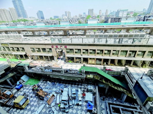通过孙先生家的窗户可以看到,一台推土机正在将拆除下来的通风管道铁皮压成片,以方便往外运输,推土机旁边还有一辆吊车。地上商铺已被清空,店铺门也基本拆除完毕,门前堆积了不少木板等建筑垃圾。从屋顶的广告招牌,能看出这里曾存在不少商铺。